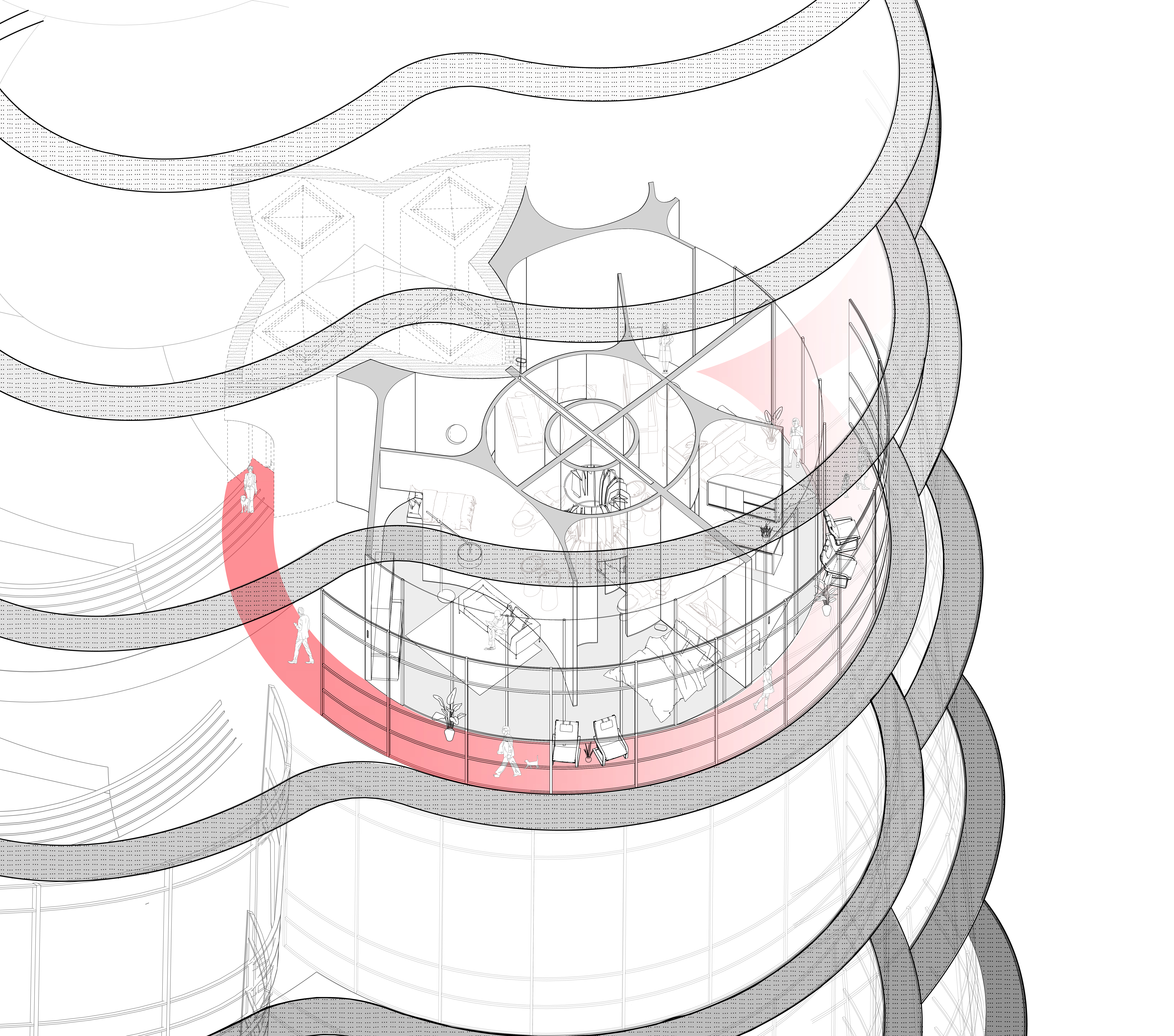 Collective housing tower proposal for the city of Rome in which the housing occupies Pope Sixtus V’s masterplan. By adopting his organization, the housing frames the various obelisks Sixtus contributed to the city, reframing the museified piazza below through calculated public circulation and observation. With Zach Bundy and Louis Medina.