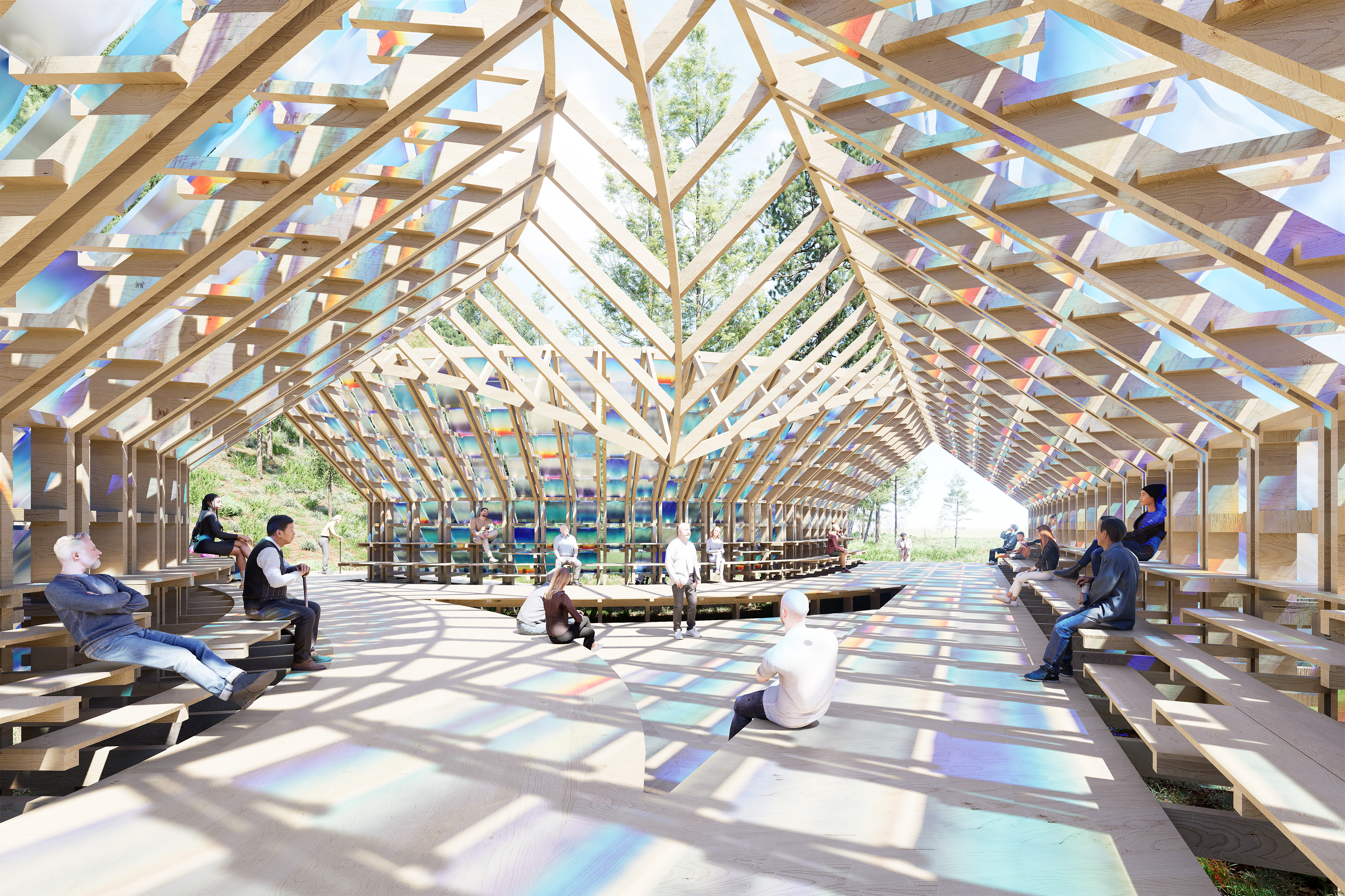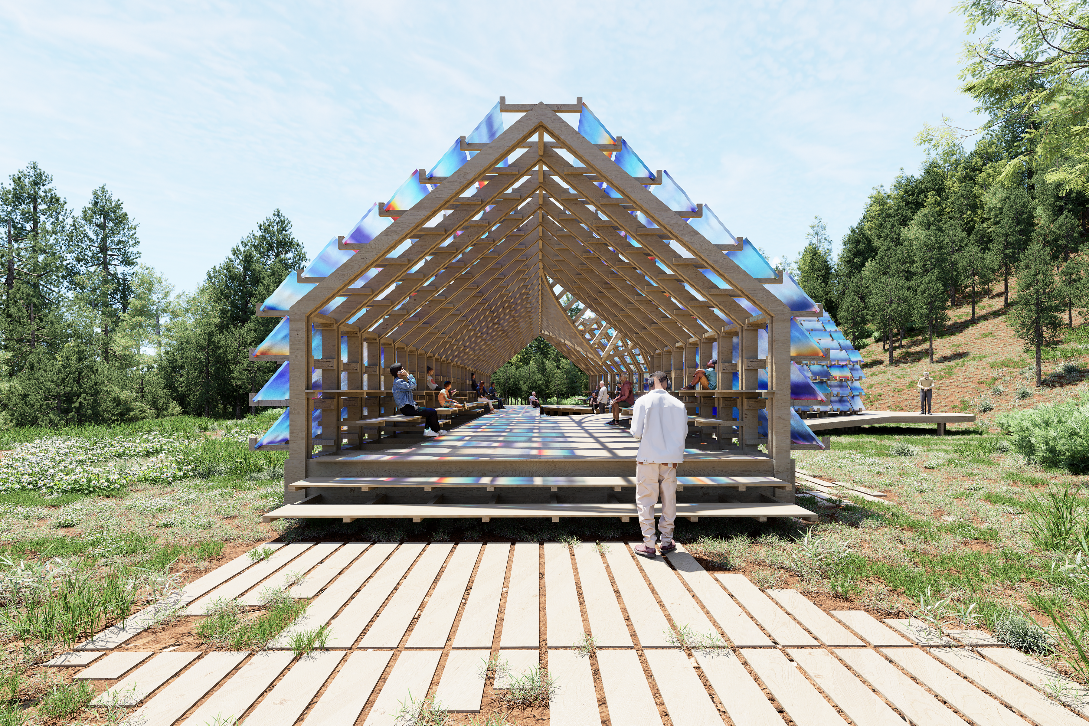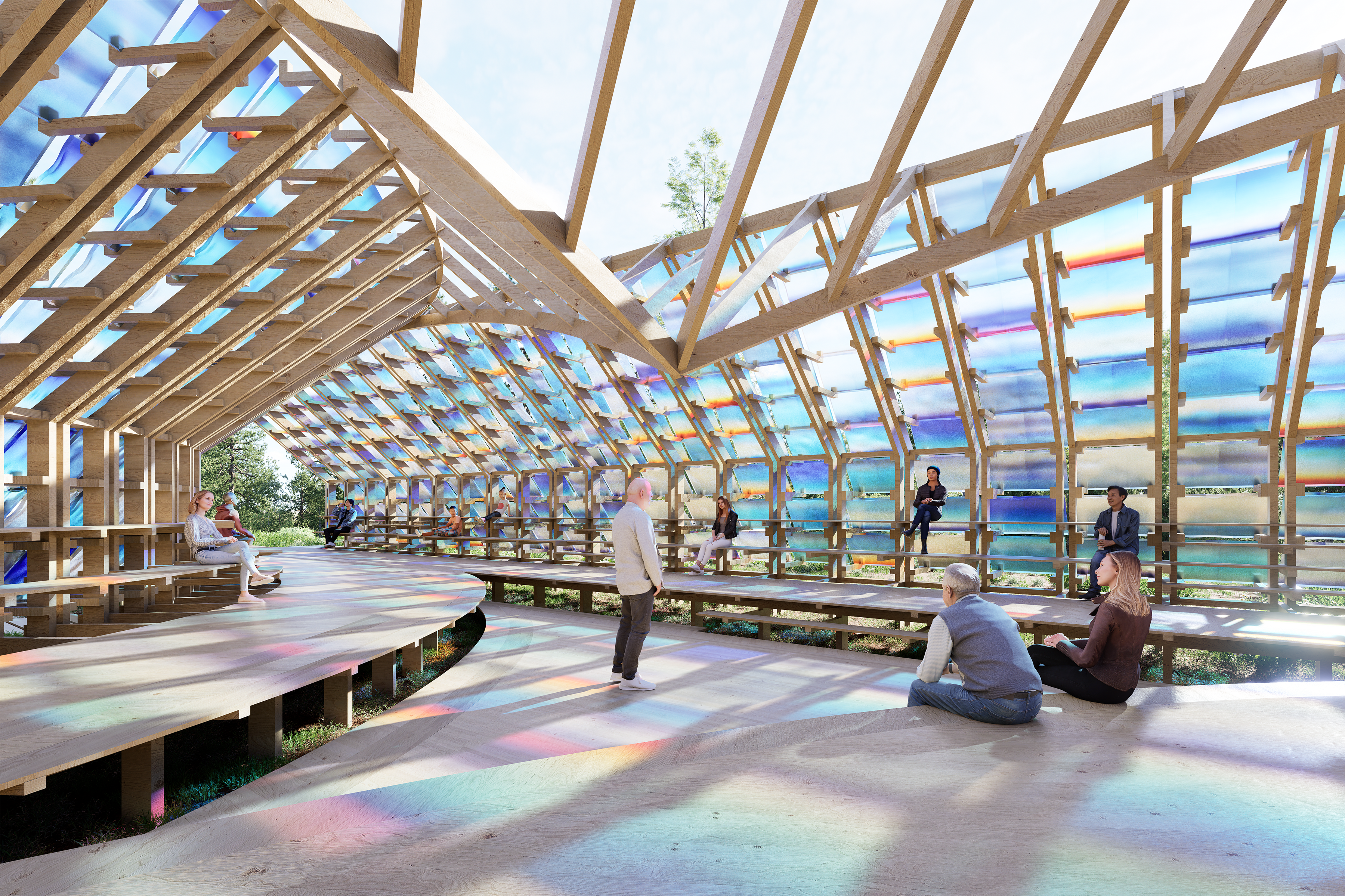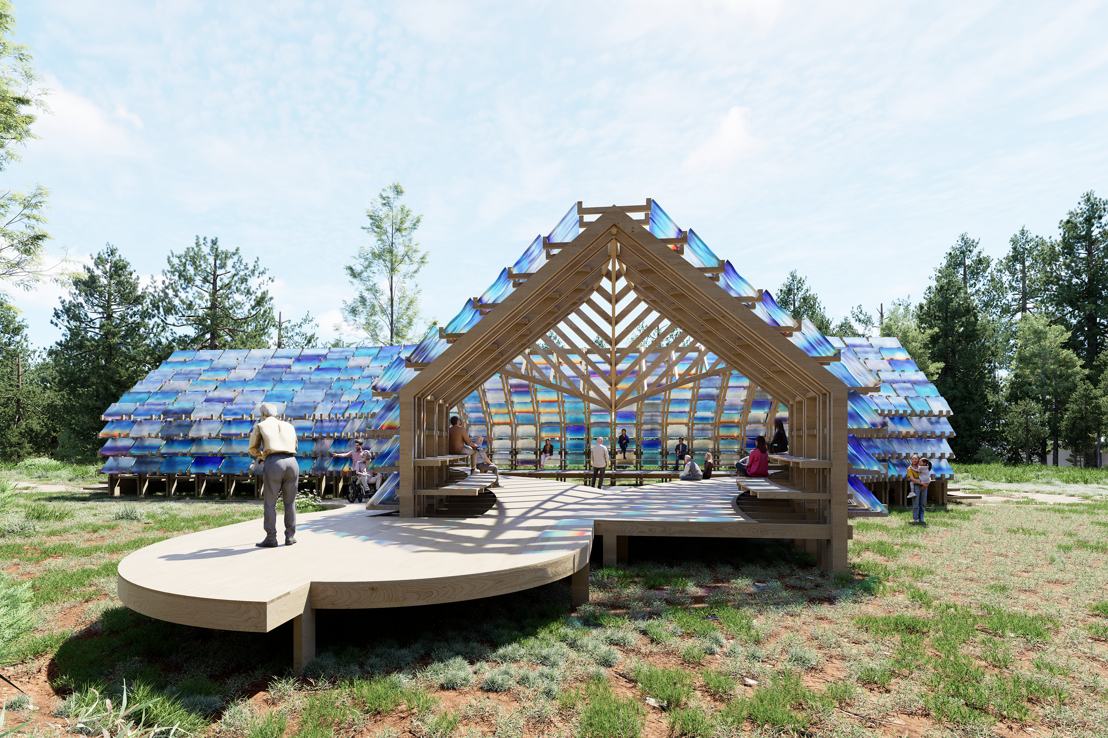 Pavilion and presentation space clad in hand-cast resin panels for hosting participants of the Green Box Arts Festival. Panel colors are based on 22 individual paintings of the Colorado sunrise. With Billy Joe Miller.