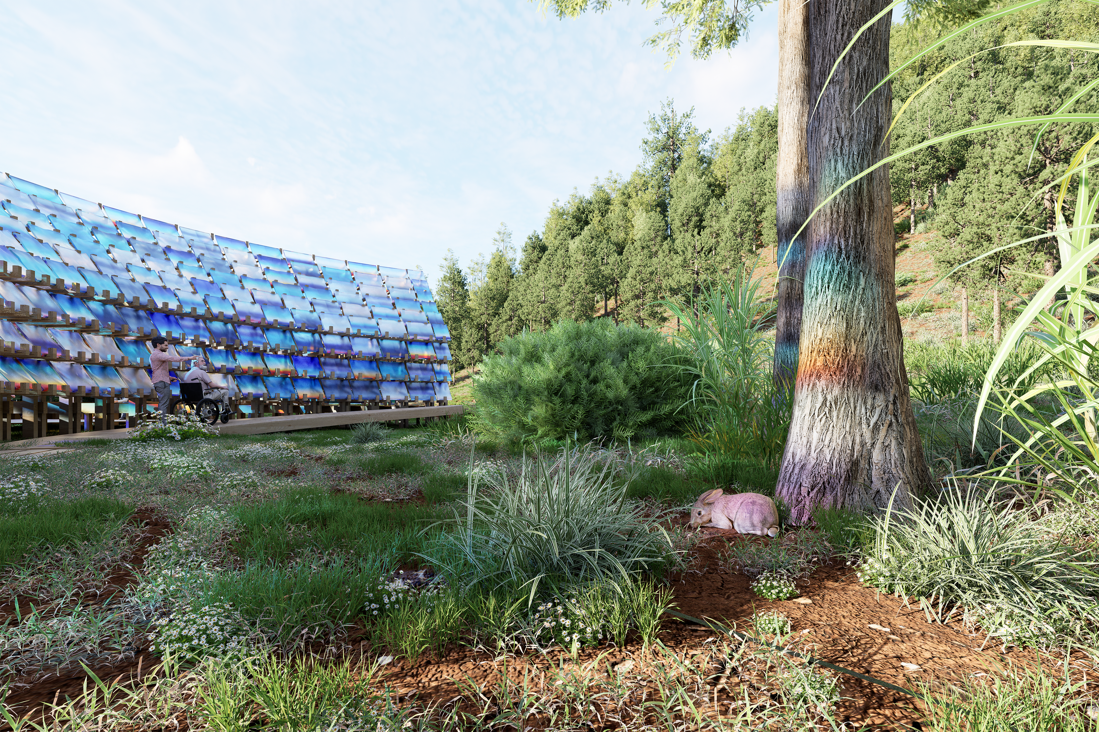 Proposal for a site-marking, steel shade structure which diffuses light into a soft pattern.